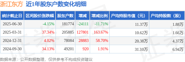 从股价来看,2025年3月31日至2025年6月30日,浙江东方区间跌幅为4.15%,在此期间股东户数减少2.41万户,减幅为11.71%。